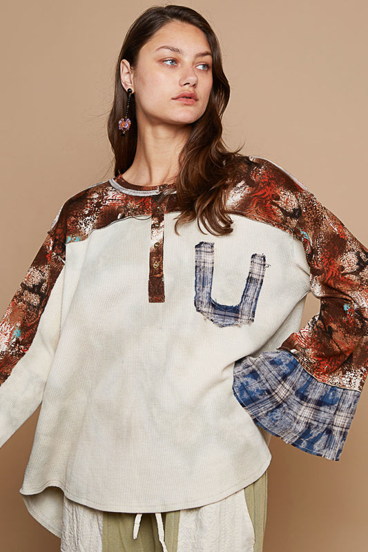 Brown and Sage Round Neck Ruffle Sleeve Thermal Stitch Top by POL