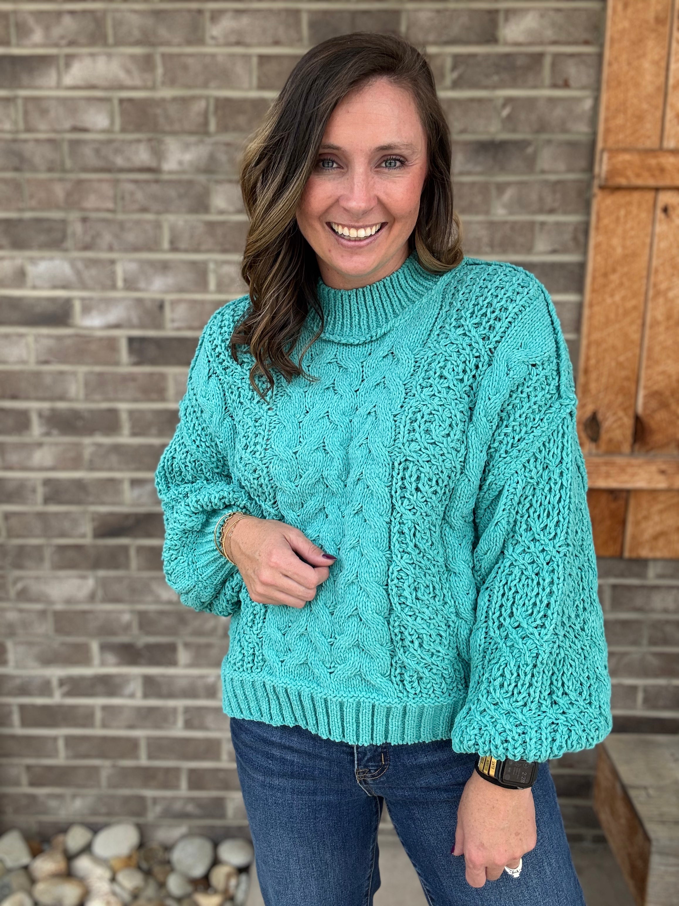 Aqua Teal Twisted Cable Knit Chenille Sweater by POL – Brumleys Expressions